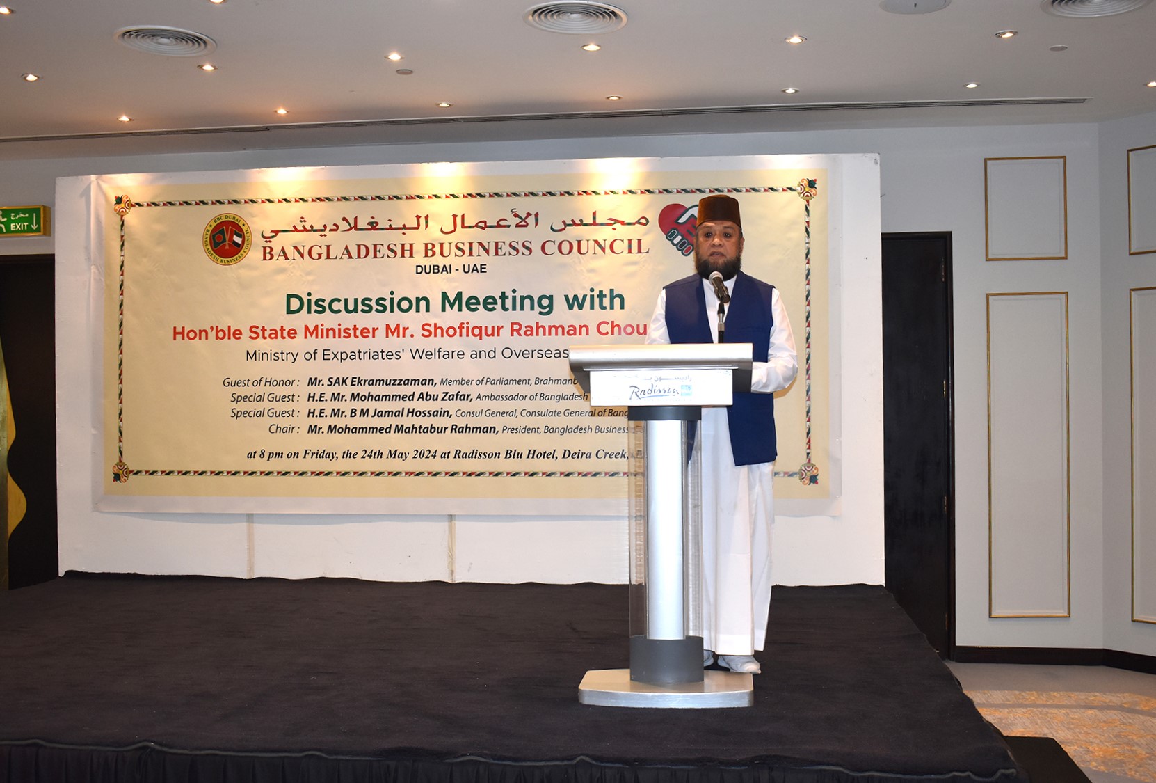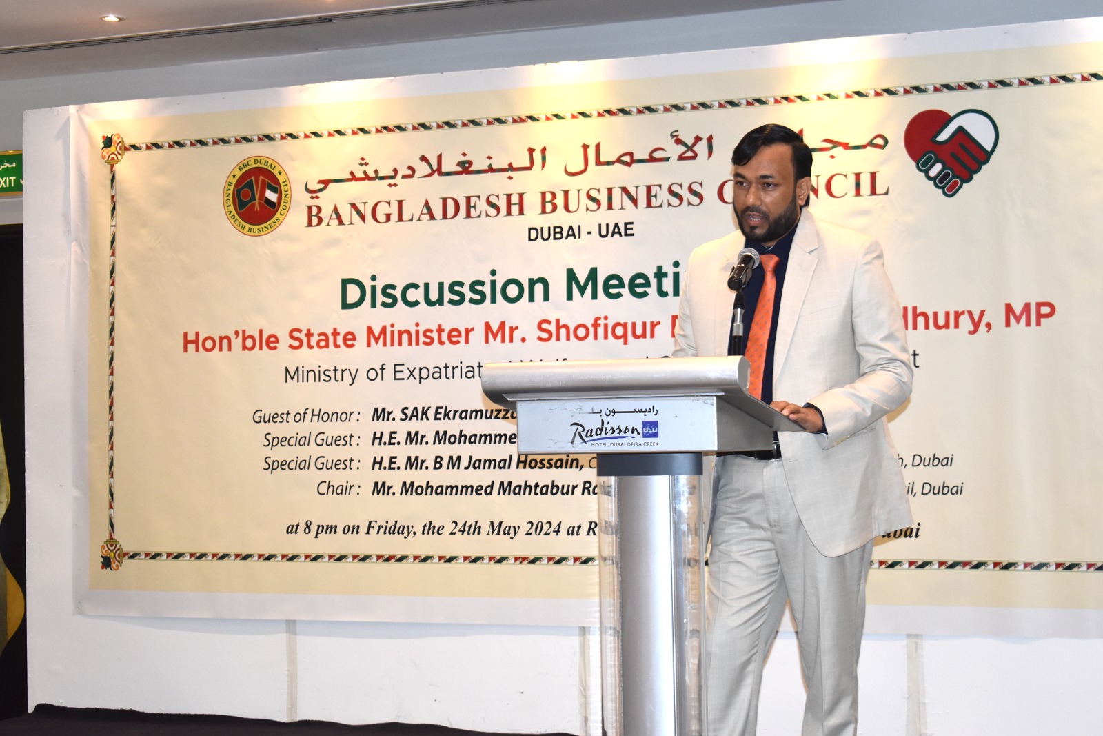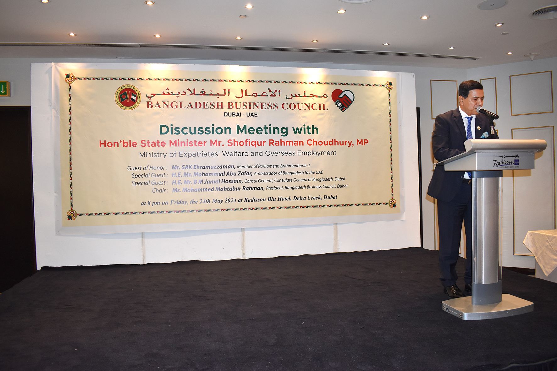 Bangladesh Business Council – Dubai (BBC-Dubai) organized a ‘Business Discussion Meeting with H.E. Shofiqur Rahman Chowdhury, MP (Hon’ble State Minister, Ministry of Expatriates’ Welfare and Overseas Employment), BBC Members, CIP Members & other invited Businessmen’ at Radisson Blu Hotel, Deira, Dubai on 24th of May 2024.